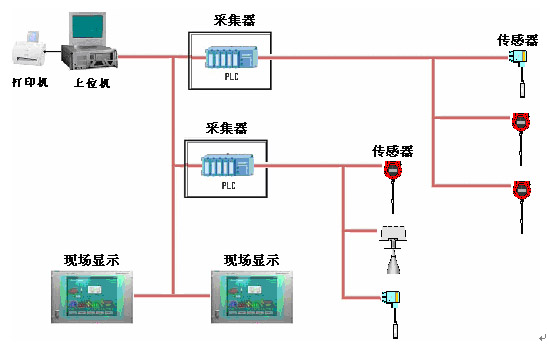 Our monitoring system is mainly composed of on-site sensors, data acquisation (PLC) and monitoring systems ( computers, touch screens, etc.). The structure is as follows: